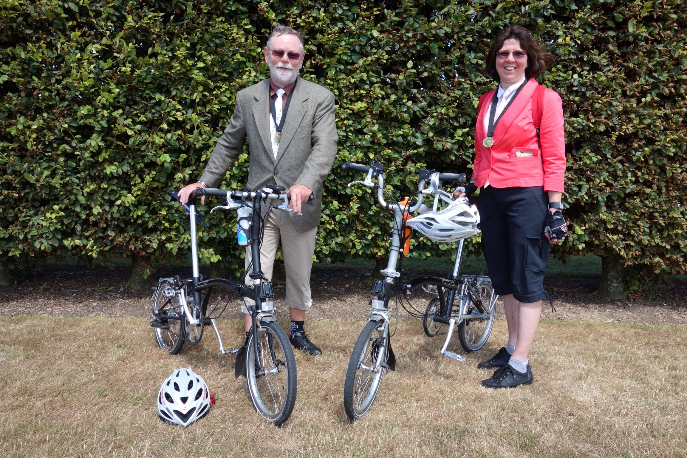 Who can run in such congestion? Stayed calm & got it all together, dodged through those still bums-up unfolding & clipped in & away! Kept off the racing line & watched swarms of Bromptons continually coming by – & then the later waves just kept whizzing through! With my heart rate “digitally restricted”, I was headed for a steady (but flat out?) ride – although the head winds were tough & the Alfine trigger shifter got a work-out to keep my cadence up. Certainly jolly hot work; new outfit next time? Had a marvelous “grandstand seat” in watching never-ending Bromptons circulating. Got lapped twice by the leaders (such a fantastic pace & legs a blur) & once by my wife (creditable 36:54 for 11th in class & her first race) – but still a lap to go for me? So tempting to “take the medal & end it all” but I soldiered on – & even managed to chat with a fellow sufferer from the Netherlands before crossing the line & stopping my Garmin at 51:16 (race timing spot-on!). Now that’s how you get your “money’s worth” in racing – before getting stuck into the recovery food & photo sessions.