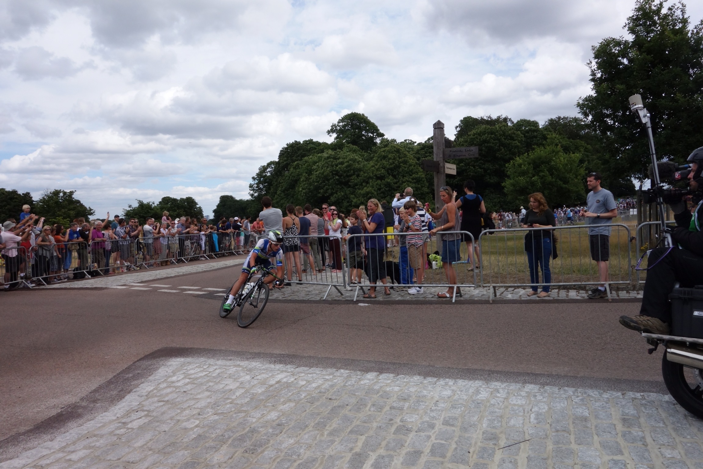 Sunday was more my cup of tea, so to speak, as the RideLondon Surrey Classic race was going to follow the 2012 Olympic course. Featuring 8 Pro-Tour teams (& lots of other Pro teams) meant for a serious cycle race. We figured to catch the action out on the course at a couple of locations – & definitely skip the crowds at the finish on The Mall – so headed out on Ralph & Robinson from our flat, intending to also include a bit of Thames touring. First off we navigated back to Richmond Park & this time (rather than driving there in Kanga) we managed to ride up Nightingale Lane! (well almost, but three-quarters of the way up is a bit of a win for both of us). In Richmond Park the course was fully barriered so we settled in at a corner that included a lovely chicane of cobblestones. No dramas with the Pros however, for they swept through rapidly – with an Orica-Greenedge rider trying to make a break on the field.