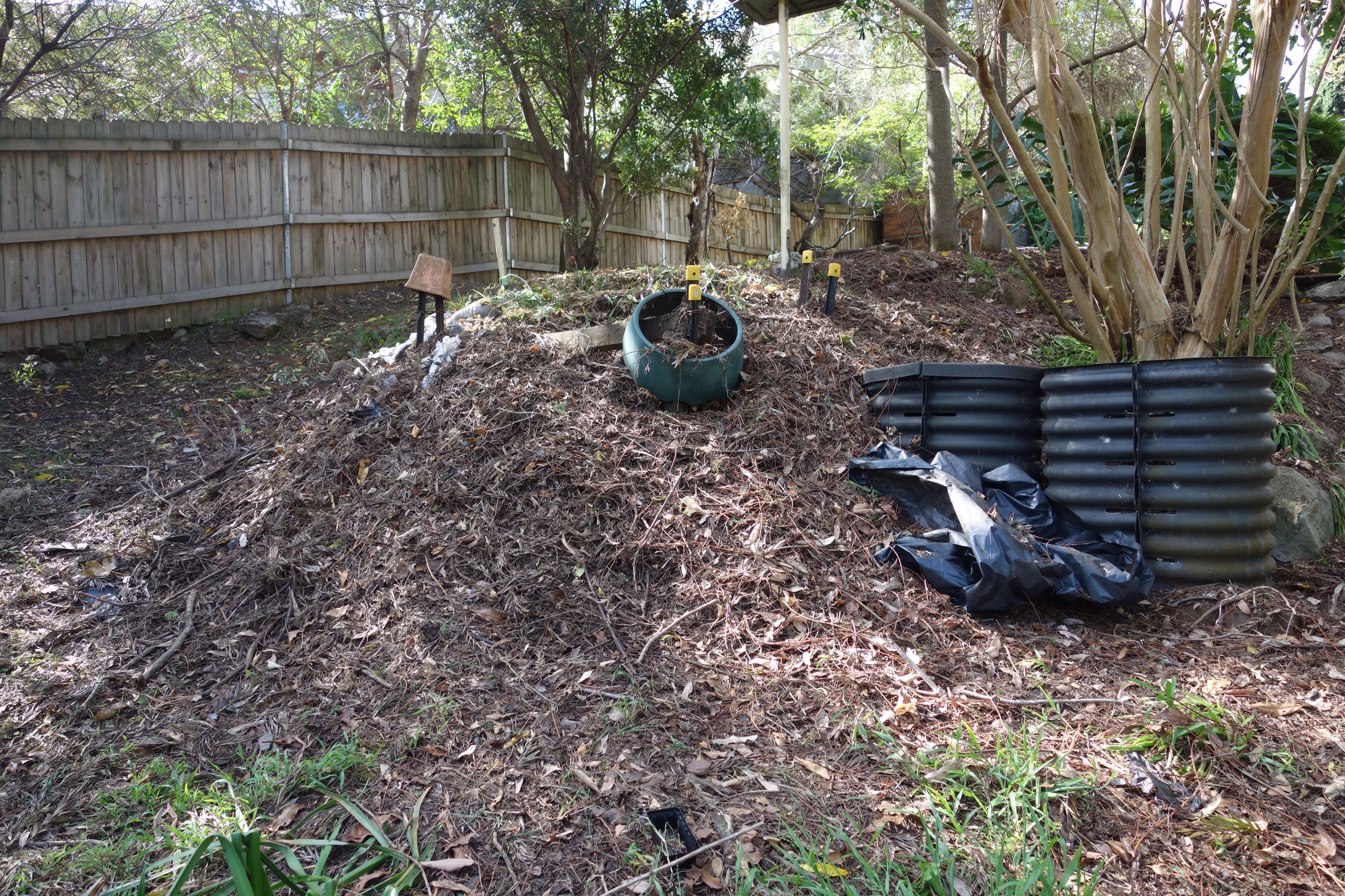Things looked fairly good when arriving home from our UK trip. However, a look into the backyard showed that a Brush Turkey had taken over & scratched leaves, twigs, garden mulch & plantings (& weeds) into a large nest mound alongside our compost heap & bins. Judging by daily activity to maintain the nest, eggs have now been laid & buried within the nest & we await their incubation & arrival of chicks.