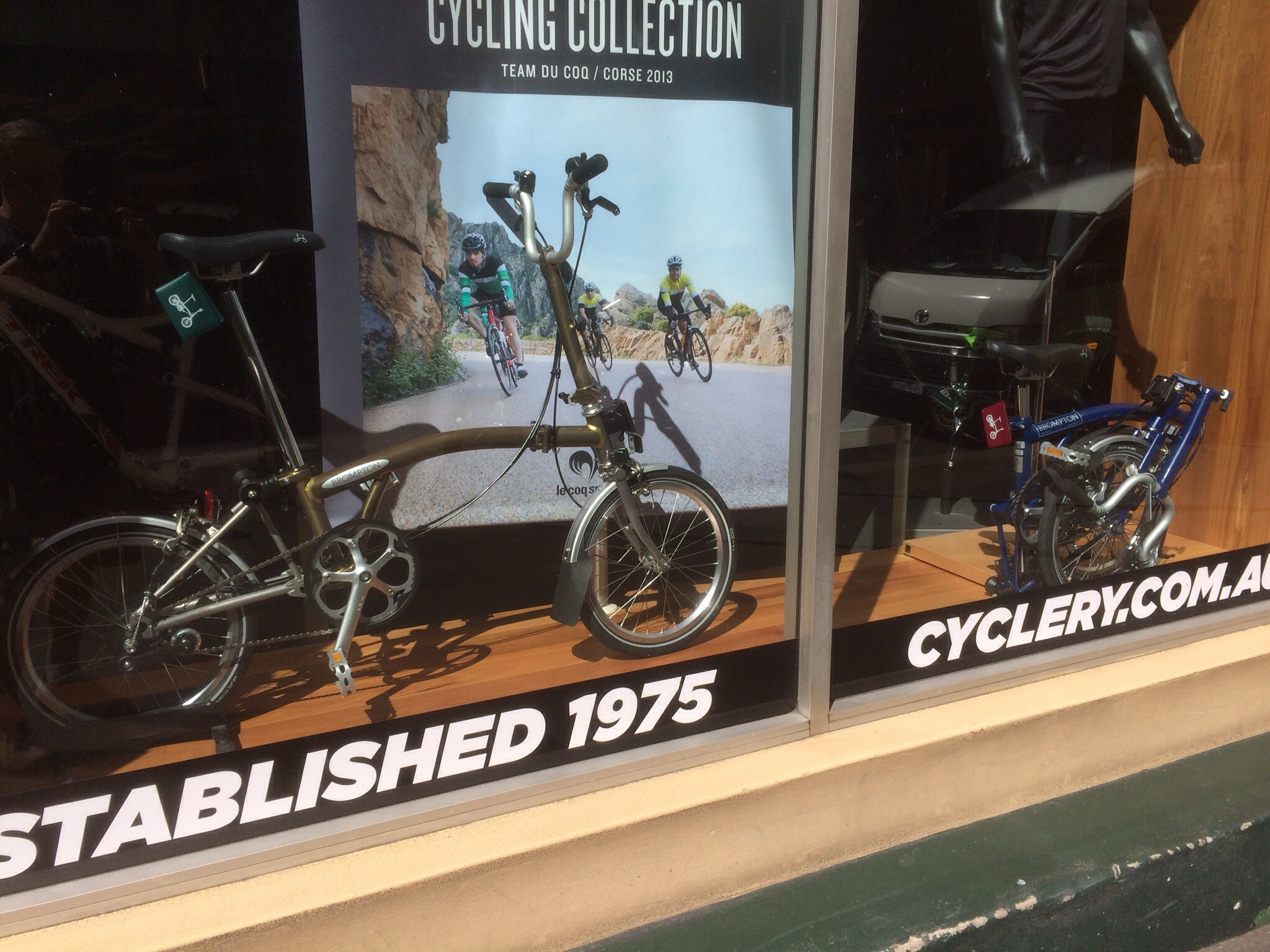 Out & about in Sydney & thought I should have a look at the refurbished Clarence Street Cycles store. Their window display caught my eye first; it included a couple of Bromptons!? Inside there was another 4 – various colours & mostly M bars I think – very surprised! Actually, I had seen Bromptons there many years ago but of late it’s only been a few Moultons (really just a token presence?). The new distributor for Australia must be doing something?