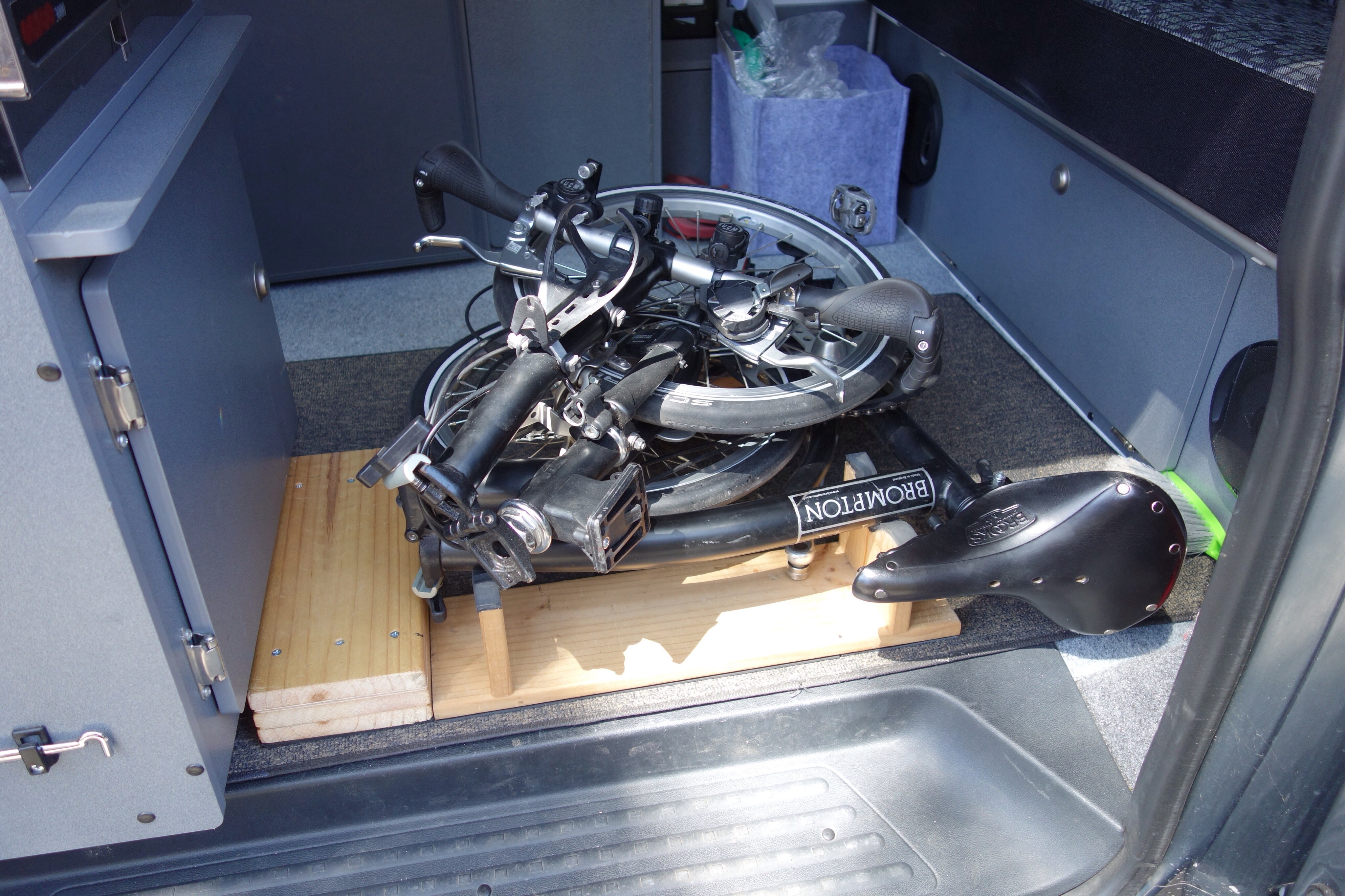 Another thing I’ve been meaning to do, is setup a support frame or such for when carrying a Brompton in the passenger area. Robinson fits neatly under the bed in the rear but Ralph usually just lays on the floor in the rear passenger area with some packing under the Alfine rear hub to avoid the pointy acorn axle nut digging into the floor. (Robinson is a rack model Brompton & when laid on the side, the rack/Ezi wheels & the MKS removable pedal adapter (with pedal removed) become three points of contact with the floor & makes for a stable package. Ralph has no rack & the wider rear frame with Alfine hub becomes one contact point, along with the MKS pedal adapter & Ezi wheel.)