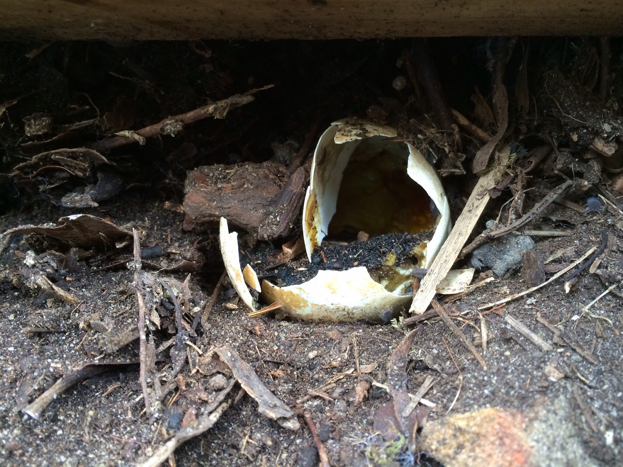 I was to hear this amusing tale when I returned home later (no guesses for who thought it to be the most amusing?). Some Internet research had disclosed that the phenomena was not unknown. It seems that the explosion is likened to the sound of a rifle shot & the overpowering smell is “unforgettable”! While I managed to miss all the fun, I did remember to take these pics of the remodeled compost area & the offending egg remnants.