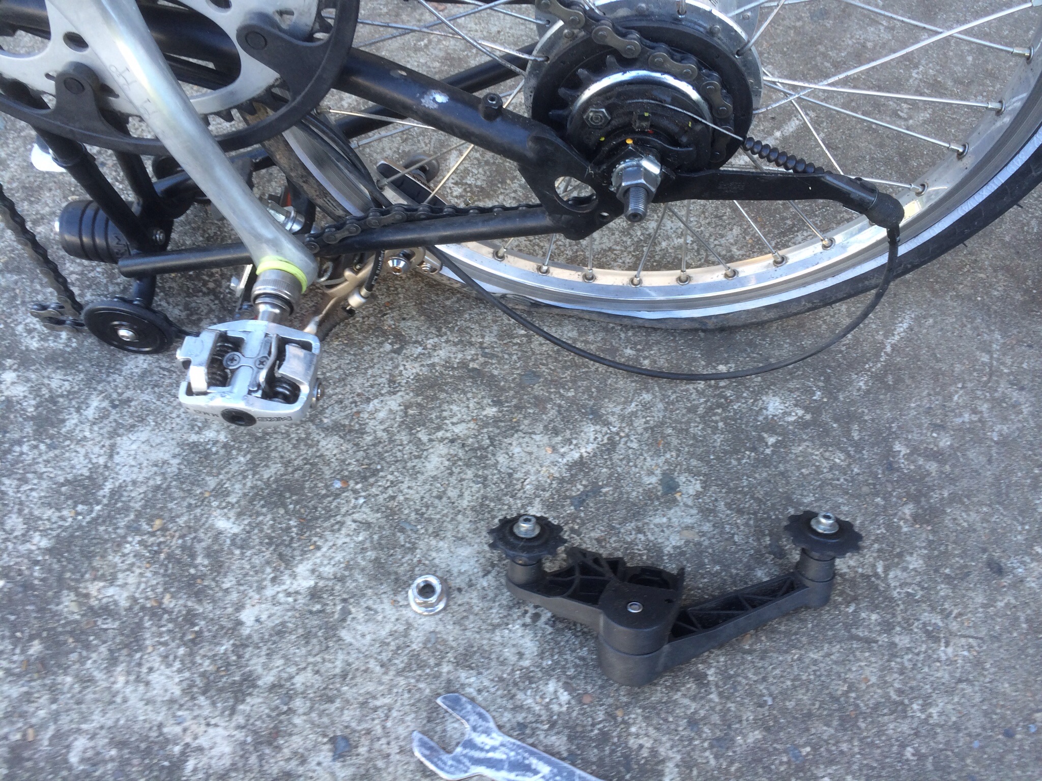 Success! Relief! Tyre on! Some air in the tyre to check for tube pinching & then deflation for the wheel refitting (I never disconnect the Brompton brake cables & so my tyres need to be fully inflated after fitment of the wheels, otherwise the inflated tyre won’t fit between the brake pads). Wheel refitted, chain in place & on with the chain tensioner (er, no – some tiredness perhaps, out of practice maybe, but reconnecting the gear change cable with the tensioner in place is “very difficult”) – refer pic –