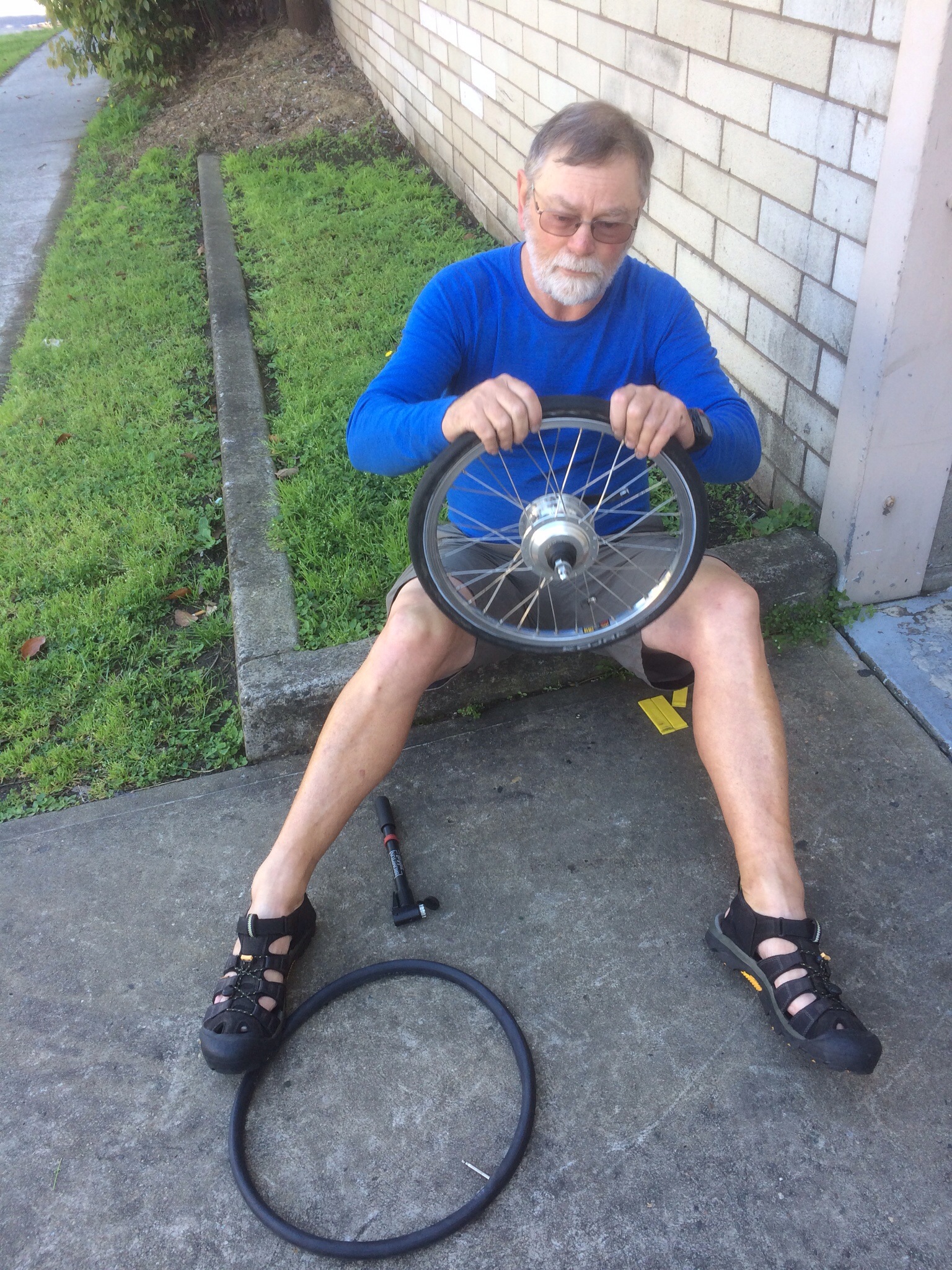 Aside from the challenge of removing a Brompton rear wheel (Ralph’s 11-speed Alfine probably no more difficult than standard – just different), I was mindful of the next task to remove (& later replace) a tyre on Ralph’s Sun rim (a very flat well in the rim profile making for little leeway when getting the tyre over the rim). My trusty Michelin tyre levers got the tyre off (I wouldn’t have risked using the original-style levers in my Brompton Toolkit – must remember to get them replaced sometime) & I removed the tube. Some air in the tube & I managed to locate the puncture hole. Using the hole as a guide, I inspected the tyre both inside & out before presuming that the glass/whatever was gone & not likely to reoffend? A new tube fitted, it was now time for the worst part of the exercise – refitting the tyre on the Sun rim. Some pics here to reflect my progress: nearly all the way & during a rest-stop, an indication of that last 10cm or so (the thumb-wrecking part?)