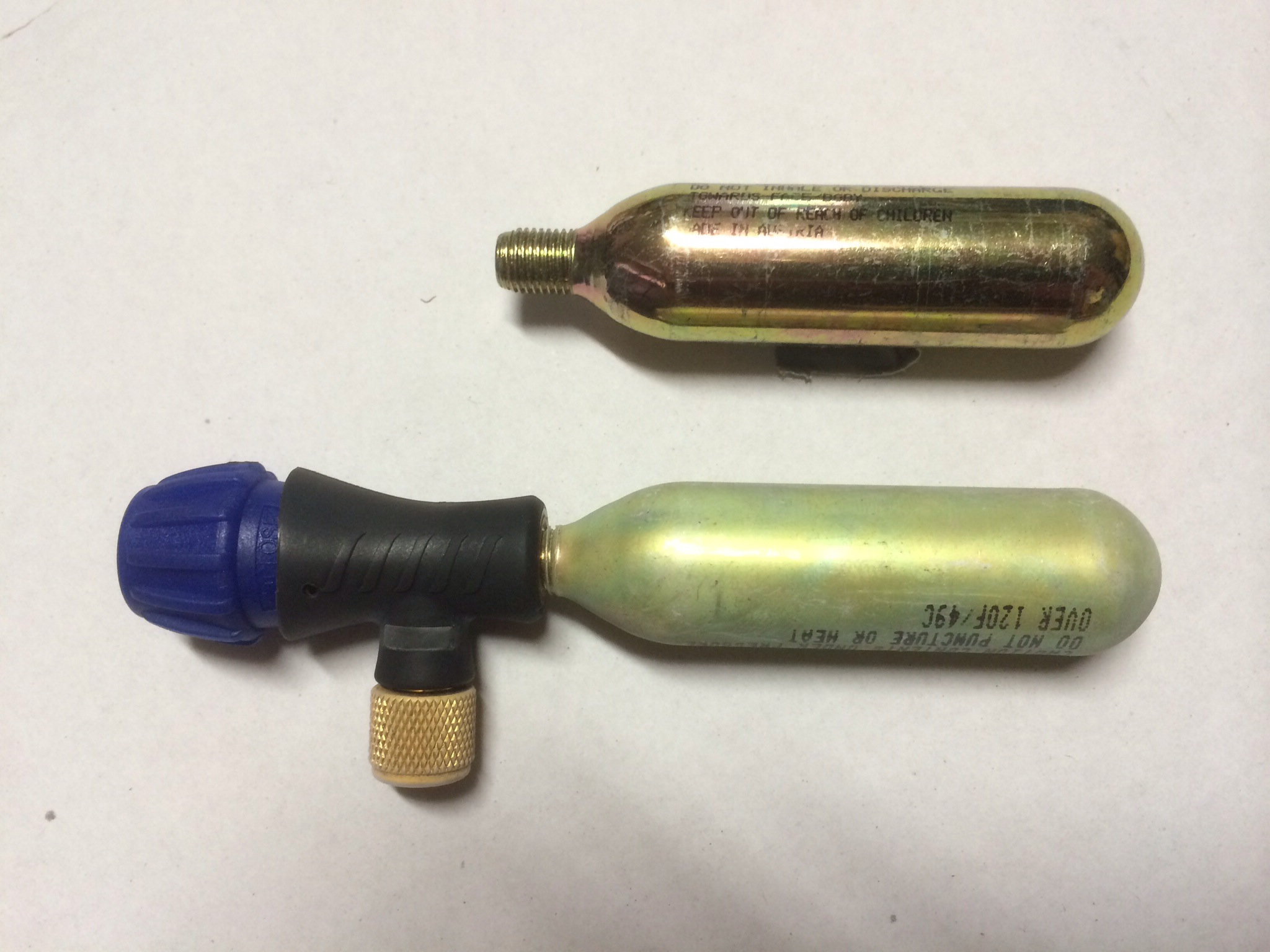 Another of my issues during the roadside tube replacement recently, was my CO2 cartridge tyre inflation “hiccup”. At home in the garage seemed an ideal time to get the practice I needed? I used cartridges to inflate both tyres & the results weren’t very comforting! For one I managed to get 7 bar pressure (100 psi?) but for the other, it was only 5 bar (this measured by connecting my floor pump & checking the gauge). This maximum inflation of 7 bar was what I would want in the tyre but it seems a bit “hit-&-miss”? Whereas my road bike inflations have always seemed successful, I think the greater number of spokes & the cramped space on the Brompton wheels make the exercise more fiddly? Thinking about it now, I should have first secured the Presta valve with the locking ring (or partially inflated the tyre with a hand pump?) to ensure the CO2 adapter pressure against the valve was stable – drat, more practice needed? (For the uninitiated, tyre inflation with a CO2 cartridge is almost instantaneous & if you don’t get it right – or you haven’t ensured the tyre is properly mounted, the tube isn’t pinched, etc – then your inflation result may not be “as expected”?! (Taxi?!…) Another caution to the “almost instantaneous” inflation is that the cartridge becomes freezing cold very quickly! – refer pic showing 2 cartridges: one unused, one just emptied)