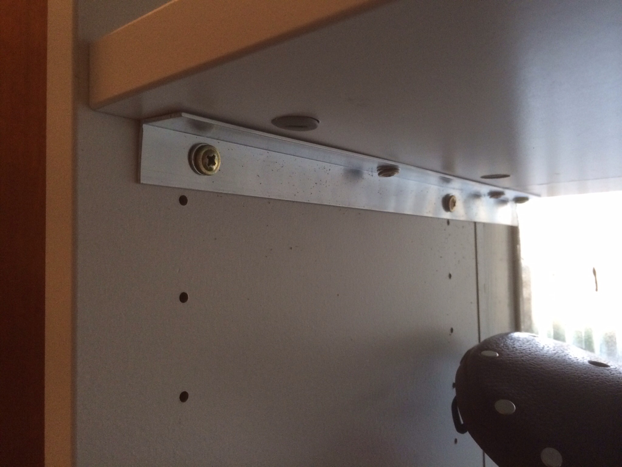 The lack of rigidity was resolved by screwing the supplied fixing strap to the top of the alcove. The one fault with the Billy bookcase however, is that the shelf-depth is not really ideal for a Brompton! While the Brompton “base footprint” is about 50cm x 23cm, the Billy shelf is only 26cm deep, which means the folded bars protrude in front of the “Bromptoncase”. Fortunately our alcove has an extra 10cm at the rear before the glass & so I was able to slice up one of the surplus shelves & mount the pieces to the rear of the fixed shelves that the Bromptons sat on. (I used aluminium angle strips under the fixed shelf to support the new extended shelf portion – & disguised the slight gaps (my sawing quality?) with adhesive white cloth tape.) Now the Bromptons can sit further back on the shelves, contained within their Bromptoncase.