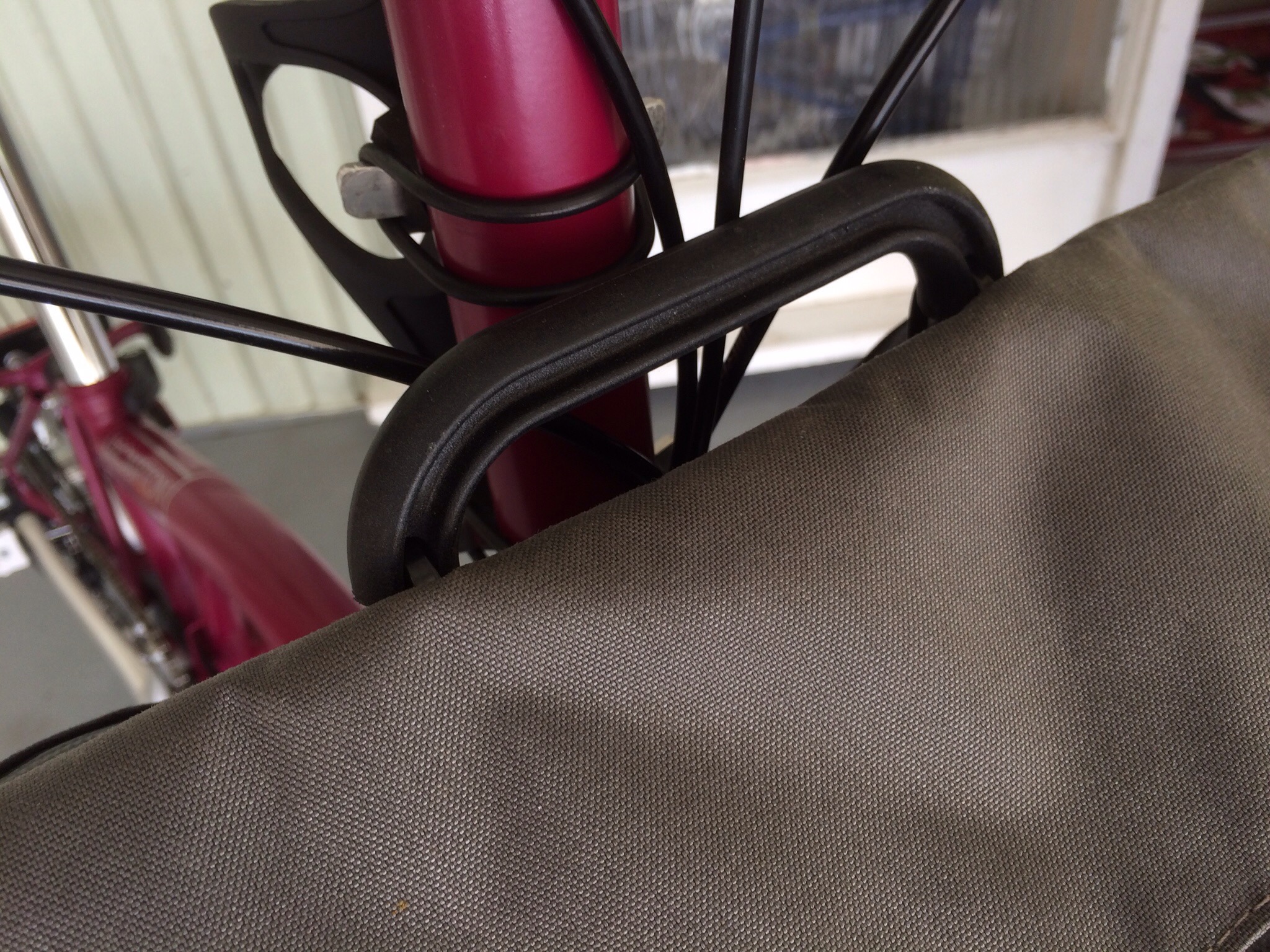 Mrs Aussie’s Brompton, Peregrine, is a standard S model & we purchased an S bag for her use. With the arrival of Clarence (an S model again) there was likely to be a need for another S bag, this time for my use. However, it seemed a shame that the C bag couldn’t be used with Clarence, as the latest brake lever design seems to allow more cable clearance & the cables aren’t snagging enough to start applying the brakes when turning the handlebars?