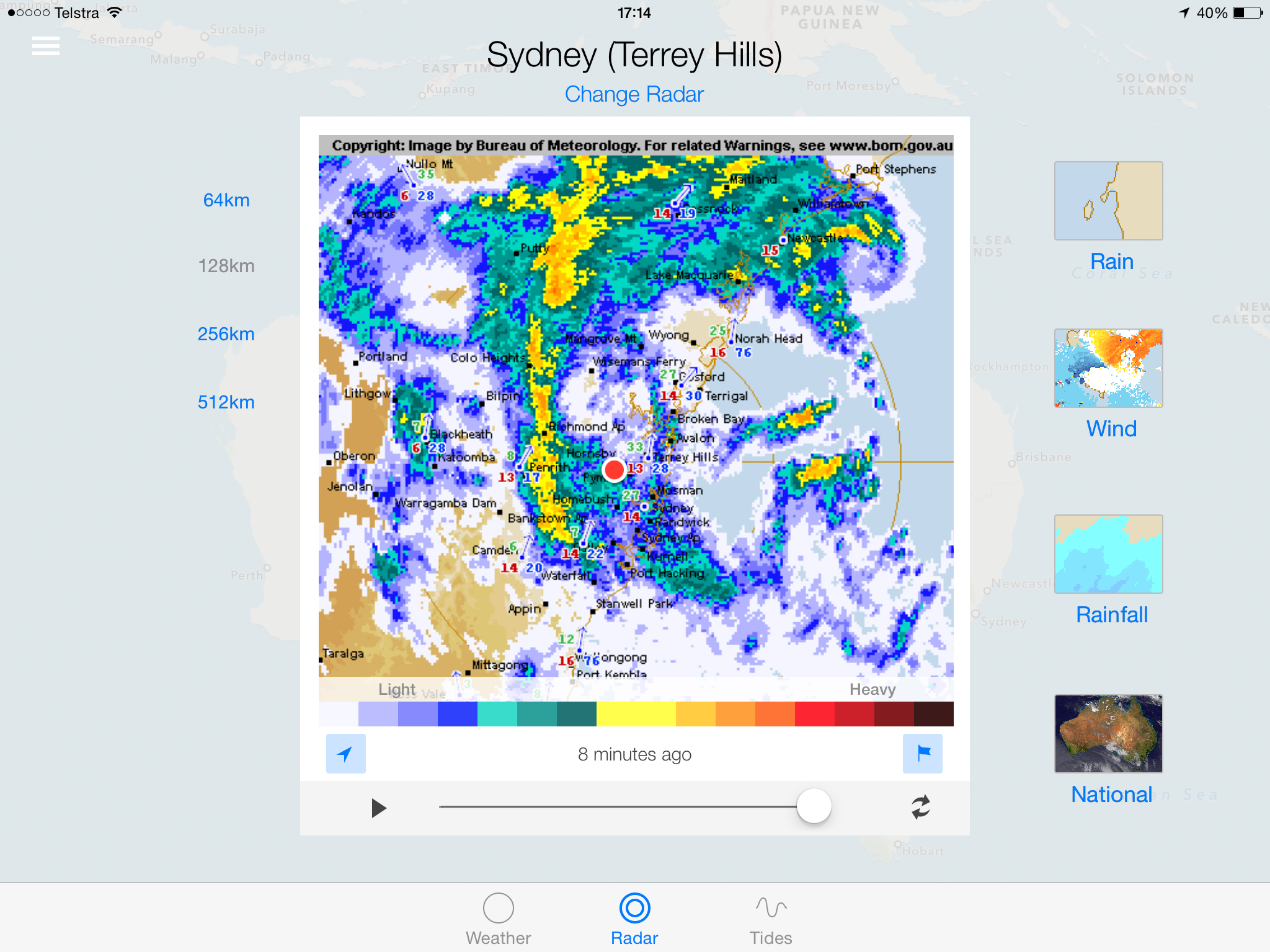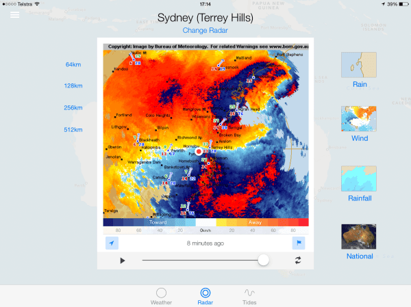 It seems that I’m having (or had) to be patient with a number of things lately. Currently it’s the weather around Sydney with storms over the past few days said to be “cyclonic”. Here’s a couple of screen snapshots from an App using BoM data. First is the wind & I cannot really comprehend it. Second is the rain & maybe I could have captured it at more intensive time? (no patience?). Needless to say, my activities have been Brompton-less & Bowls-free. Maybe I can catch up with some blog posts?