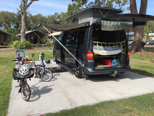 So, a short break to the Hawks Nest & Tea Gardens area to the north of Sydney saw the Tardis carrying our Bromptons Peregrine & Clarence.