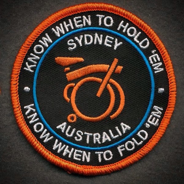 The Brompton logo cloth badges may be available at the major Brompton shops in Sydney. I’ve recently seen them at Omafiets & would expect CheekyTransport & BelroseBicycles to have them too.