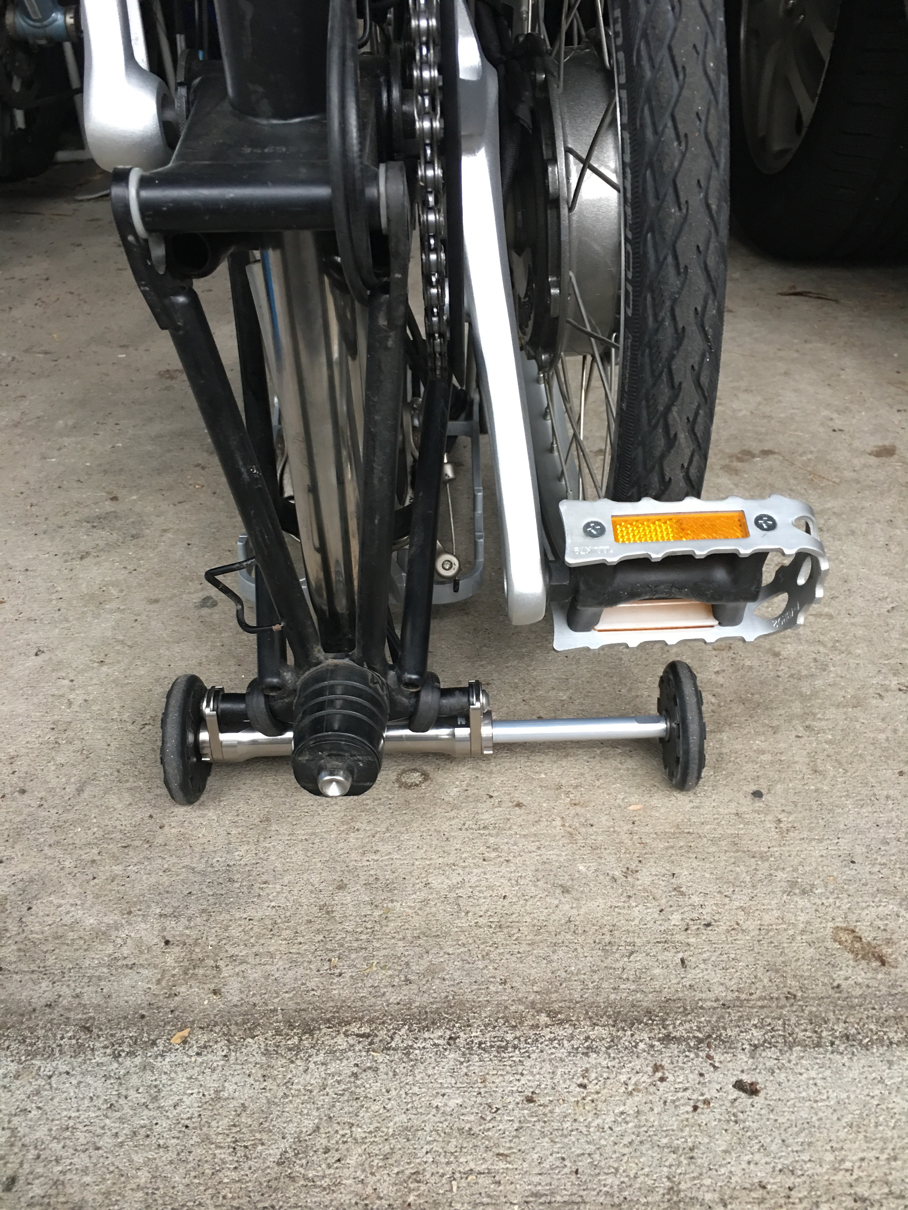 Knowing Ralph-e was going to become considerably heavier after the electric conversion, & probably needing good stability when folded & rolling, in preparation I moved/robbed Robinson’s rear rack (after all, the rack weight was unlikely to be noticed on Ralph-e & Robinson’s role as “spare” would just as easily be accomplished as an M6L?). This turned out to be a very worthwhile operation. However, what I hadn’t anticipated was the borderline stability when Ralph-e was folded (especially with the luggage bag fitted). With the front wheel motor & battery weight concentrated outside the center-line of a folded Brompton, great care was needed to avoid toppling when transporting, etc. Seeing a BikeFun Eazy wheel extender on a Brompton at the Urban Challenge, what I may have considered as “functional bling” now leapt into mind as “essential function”? Sure enough, BikeFun’s brilliant gadget was right at home on Ralph-e & has quickly been integrated into the Brompton fold sequence (i.e. “Left pedal down, right wheel out, park, etc…”)