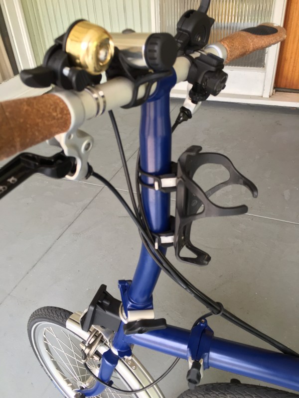 My Brompton bidon cage system is still my favourite but it doesn’t suit someone that wants to use their folded Brompton as a shopping trolley, with handle bars unfolded & a bag on the luggage block – because the cage would foul the bag & regularly removing/installing the cage is best avoided. (Whoops, see update below.) A cage that is readily removable is the Monkii system but after trying one for some time, I’m not keen on 2 aspects of the design. First, I don’t like strapping the bottle to the cage & having to remove the two together when drinking. The killer issue though, is that the Monkii cage can readily be ejected when riding over bumps. So, here’s my attempt at fixing those 2 issues…
