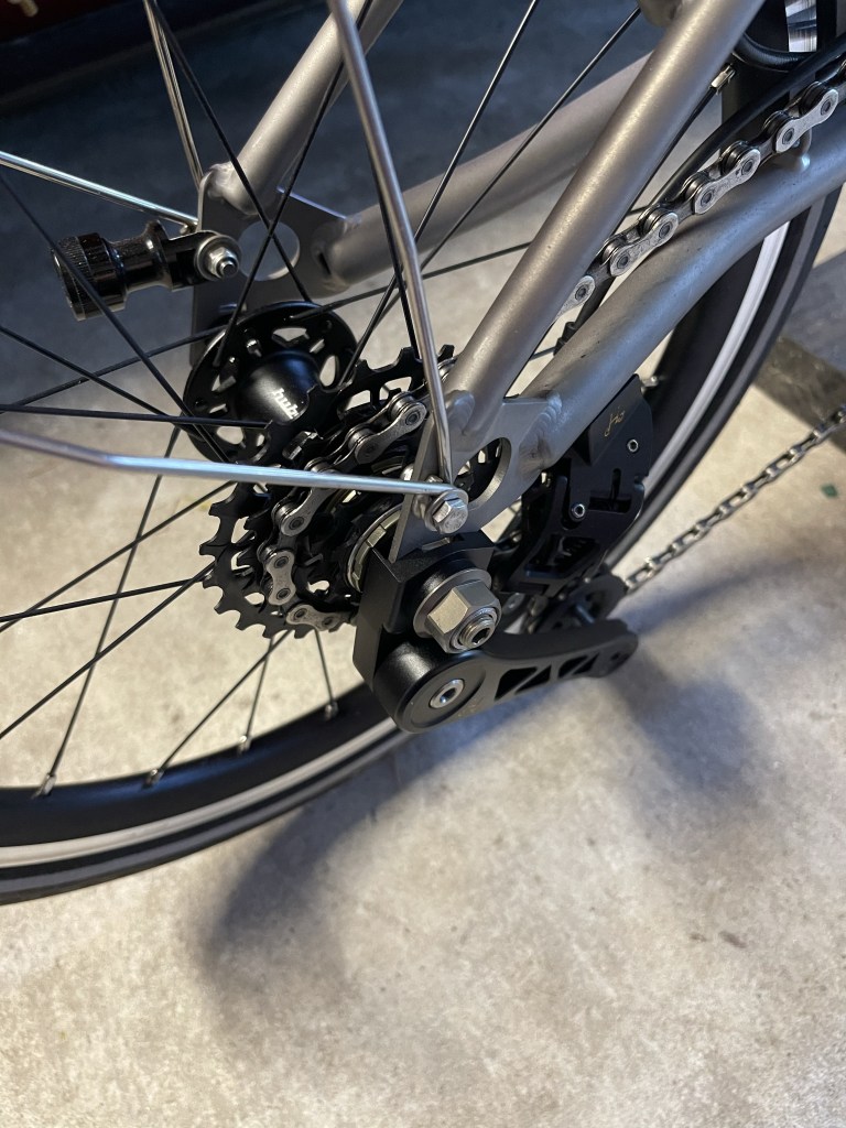 Clarence has a Brompton 2speed wheel & a BrommiePlus 5speed freehub & fitted with a 3speed MiniMods UniBody cassette (11/14/17T) & additional cogs (21/26T).