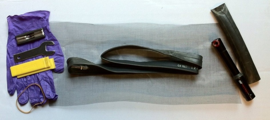 A spare Schwalbe SV4 tube (Presta valve type) fits into the rear section of the main frame. My method of insertion is to double the tube over, lightly twist it into a spiral & then wrap this with a piece of fibreglass insect screen mesh (about 45cm by 20cm). This mesh “tube” then slides into the frame with far less friction than the tube alone. The length of the mesh fills the tube space & is easy to pull out.